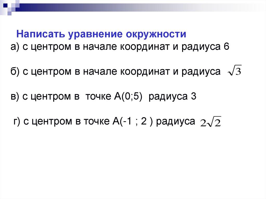 Написать уравнение окружностиа) с центром в начале координат и радиуса 6