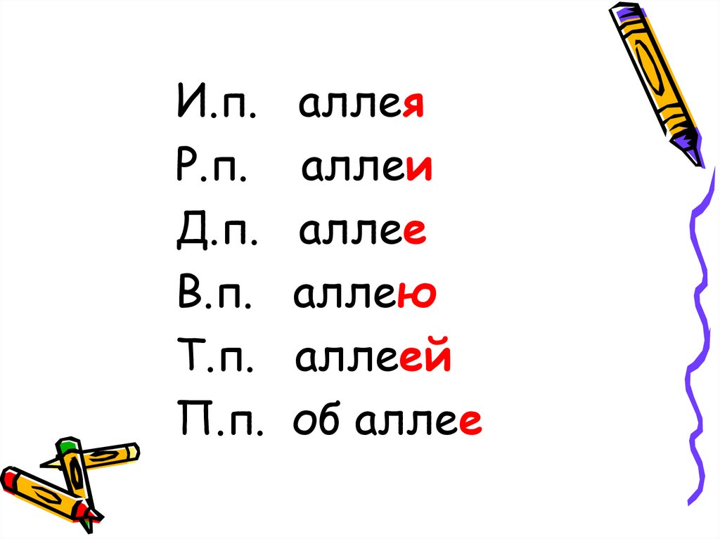 1. Измените по падежамсуществительные: аллея, Мария,