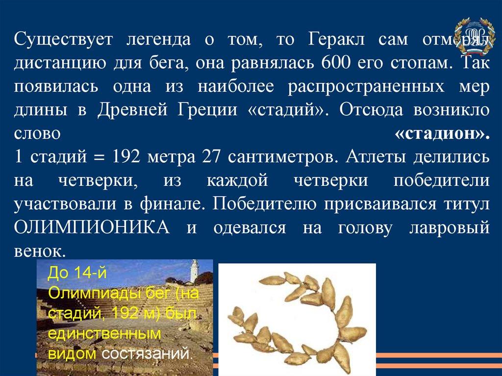 Существует легенда о том, то Геракл сам отмерялдистанцию для бега, она равнялась 600 его стопам. Так