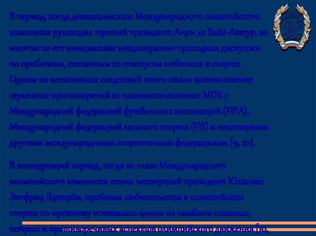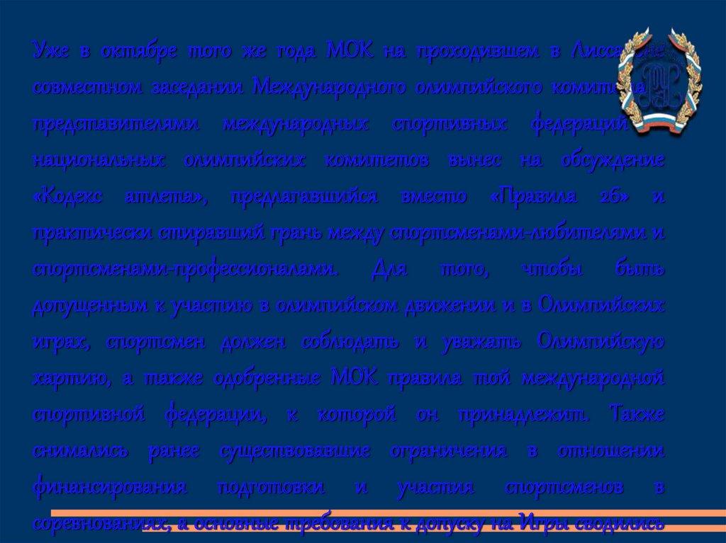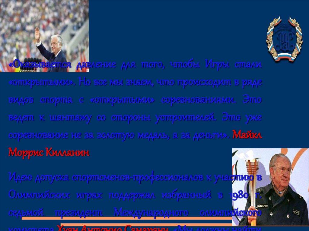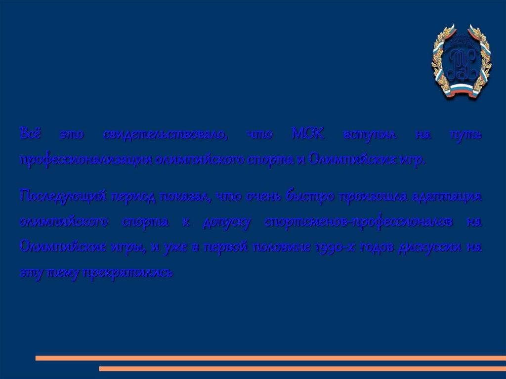 Всё это свидетельствовало, что МОК вступил на путьпрофессионализации олимпийского спорта и Олимпийских игр.