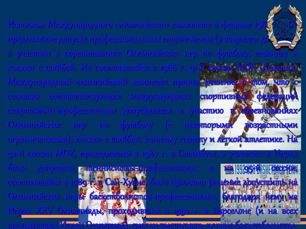 Исполком Международного олимпийского комитета в феврале 1985 г. внеспредложение допуске профессиональных спортсменов (в возрасте до 23 лет)