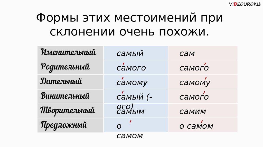 Формы этих местоимений присклонении очень похожи.