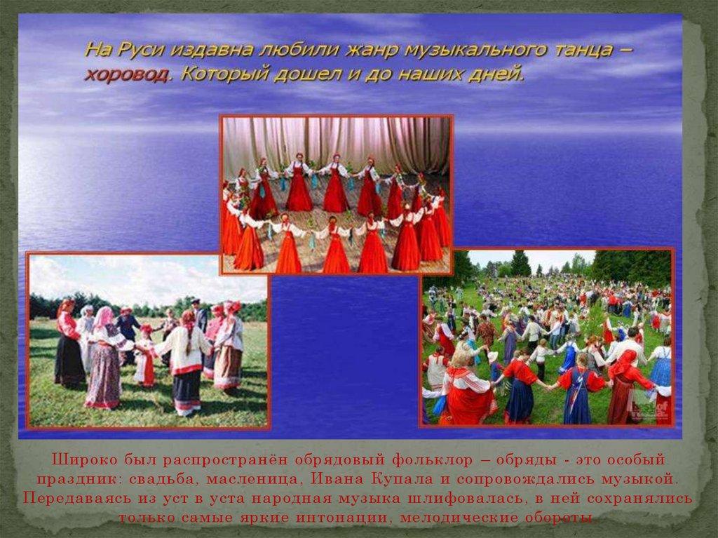 Широко был распространён обрядовый фольклор – обряды - это особыйпраздник: свадьба, масленица, Ивана Купала и сопровождались музыкой.