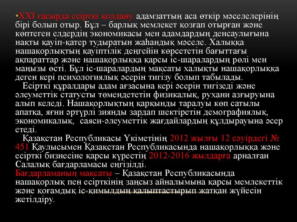 •XXI ғасырда есірткі қолдану адамзаттың аса өткір мәселелерініңбірі болып отыр. Бұл – барлық мемлекет қозғап отырған және