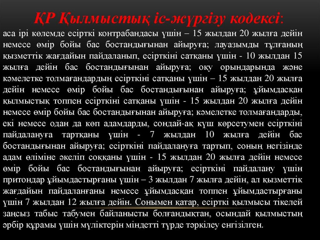 ҚР Қылмыстық іс-жүргізу кодексі:аса ірі көлемде есірткі контрабандасы үшін – 15 жылдан 20 жылға дейін
