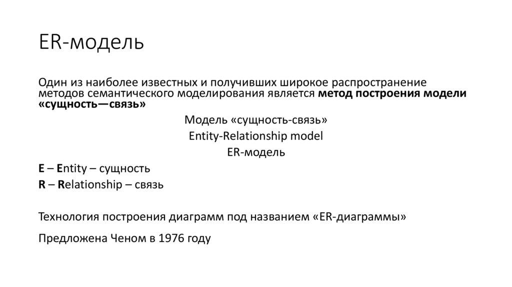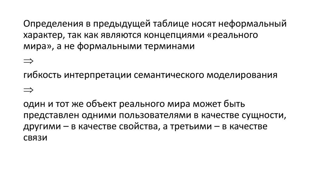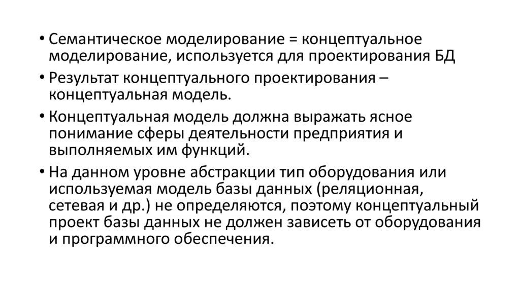 • Семантическое моделирование = концептуальноемоделирование, используется для проектирования БД