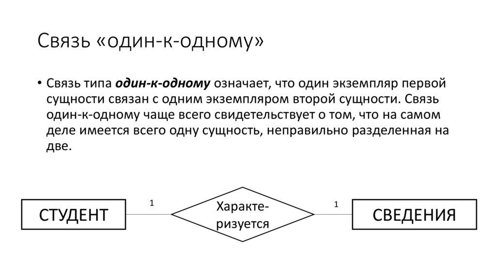 Связь «один-к-одному»• Связь типа один-к-одному означает, что один экземпляр первой