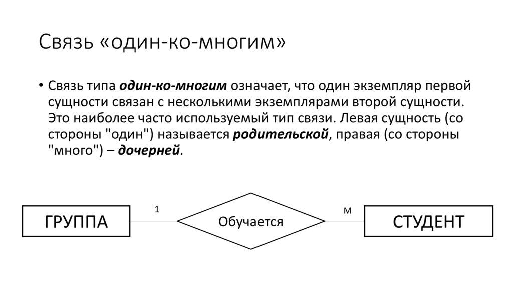 Связь «один-ко-многим»• Связь типа один-ко-многим означает, что один экземпляр первой