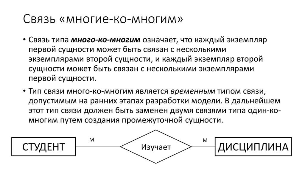 Связь «многие-ко-многим»• Связь типа много-ко-многим означает, что каждый экземпляр