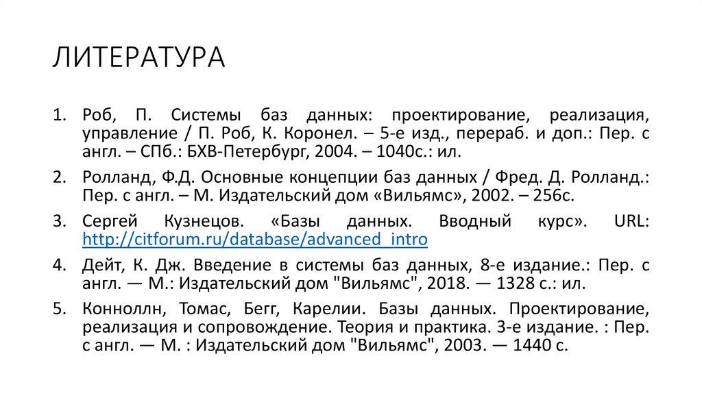 ЛИТЕРАТУРА1. Роб, П. Системы баз данных: проектирование, реализация,