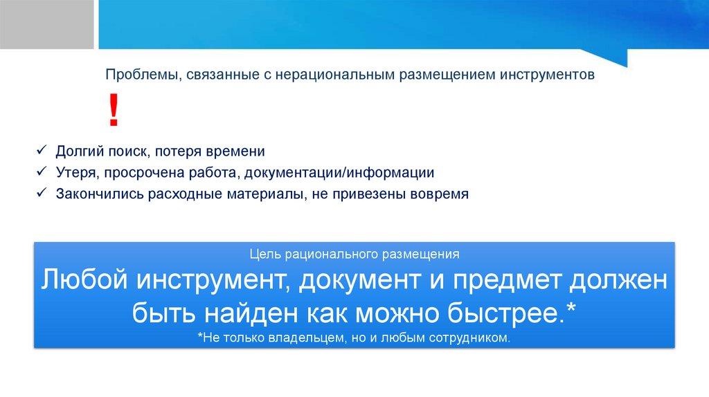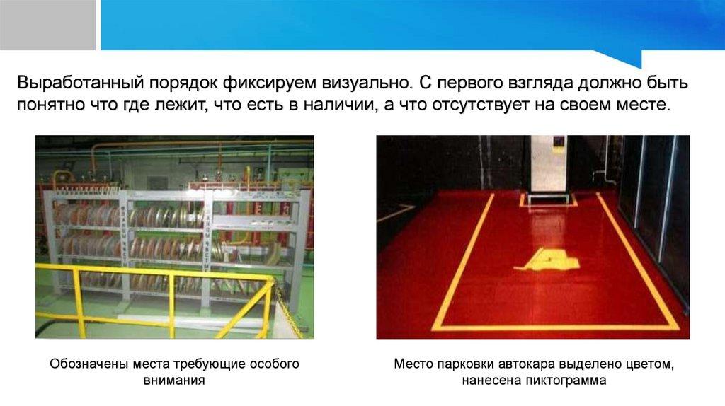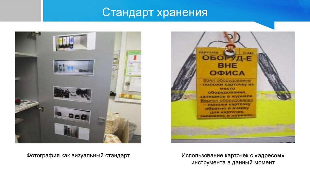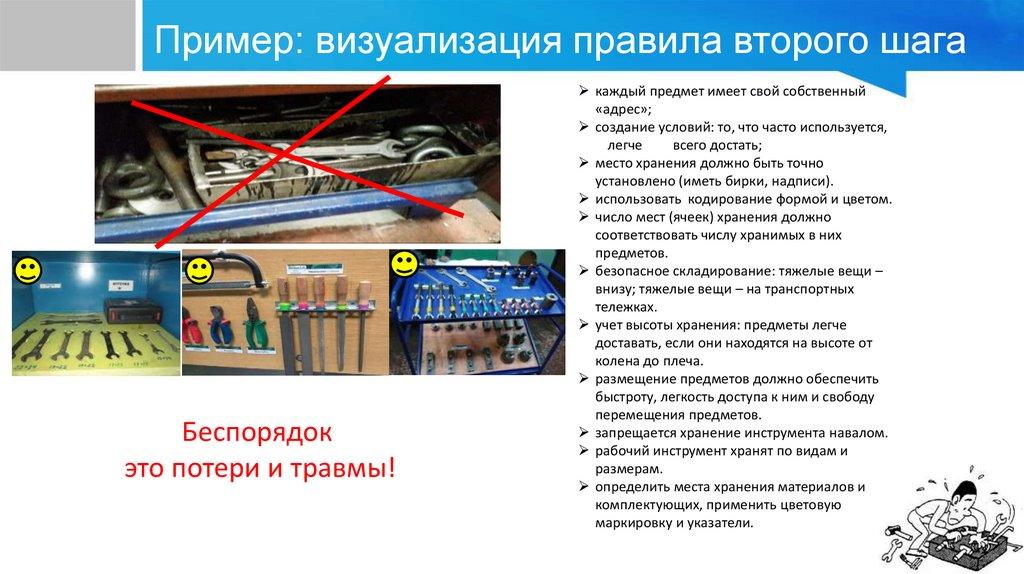 Выработанный порядок фиксируем визуально. С первого взгляда должно бытьпонятно что где лежит, что есть в наличии, а что отсутствует на своем месте.