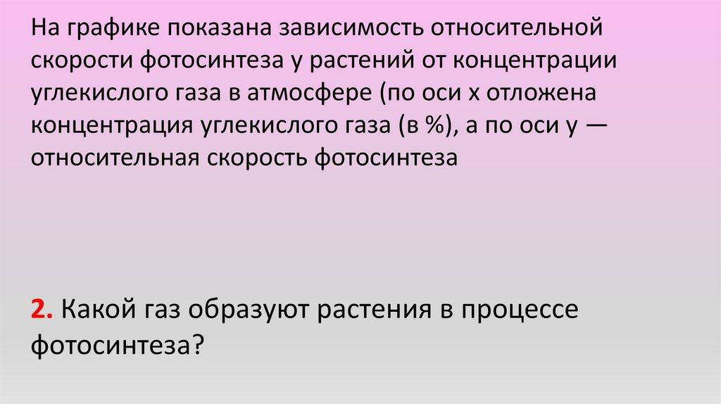 На графике показана зависимость относительнойскорости фотосинтеза у растений от концентрации