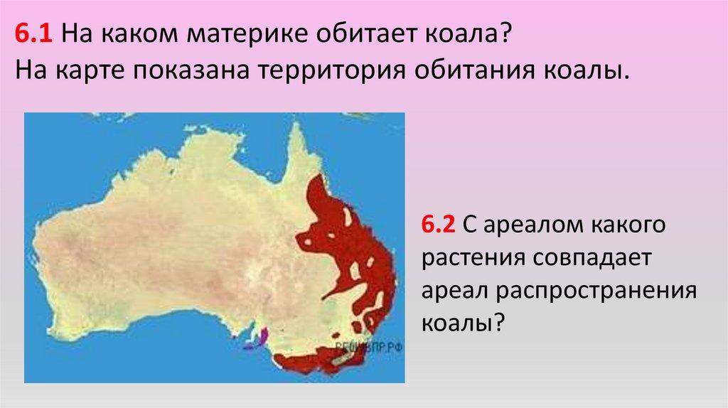 6.1 На каком материке обитает коала?На карте показана территория обитания коалы.