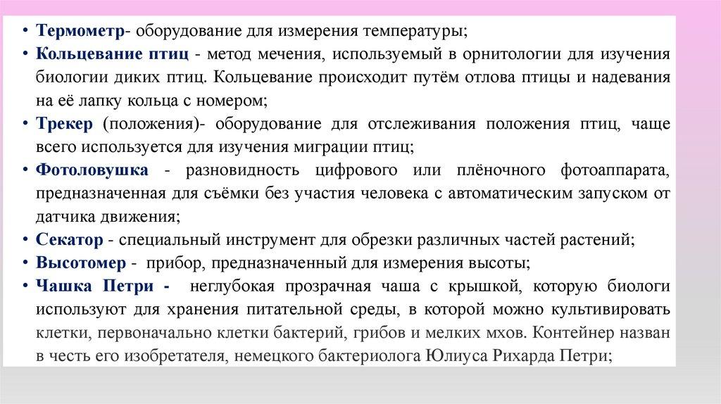• Термометр- оборудование для измерения температуры;• Кольцевание птиц - метод мечения, используемый в орнитологии для изучения