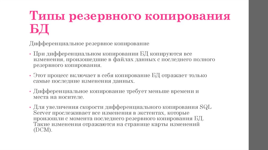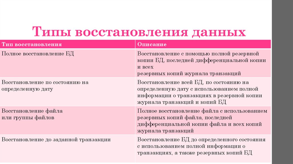 резервная копия - полная или частичная копия БД, журнала транзакций, файла или группы