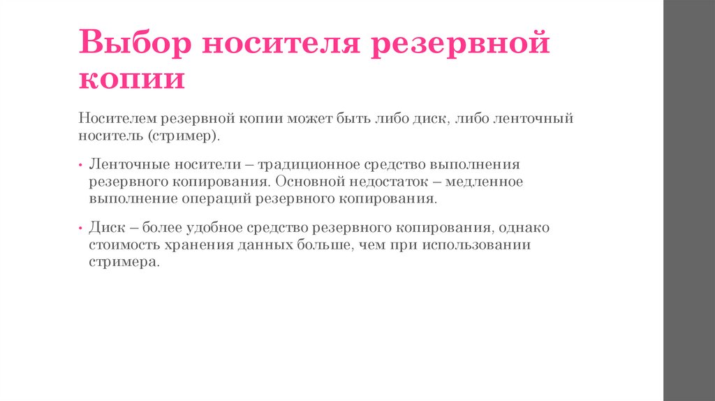 Носителем резервной копии может быть либо диск, либо ленточный