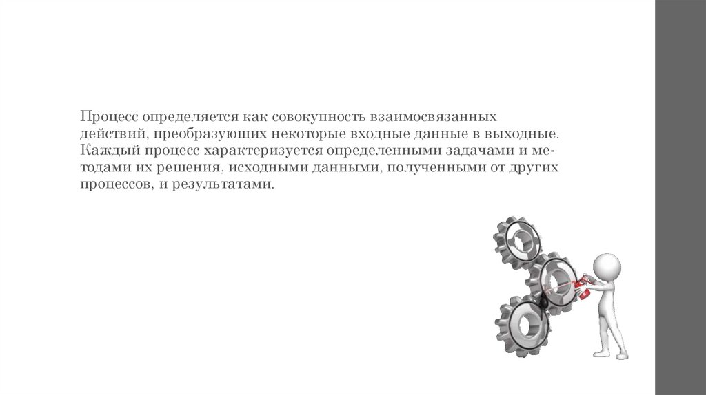 Процесс определяется как совокупность взаимосвязанныхдействий, преобразующих некоторые входные данные в выходные.