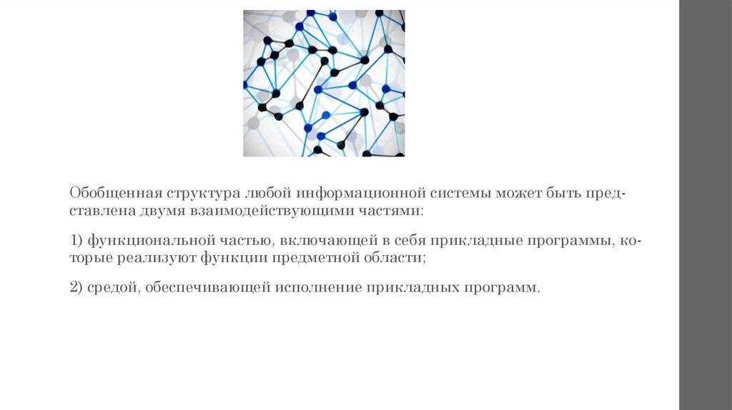 Обобщенная структура любой информационной системы может быть представлена двумя взаимодействующими частями:1) функциональной частью, включающей в себя прикладные программы, которые реализуют функции предметной области;