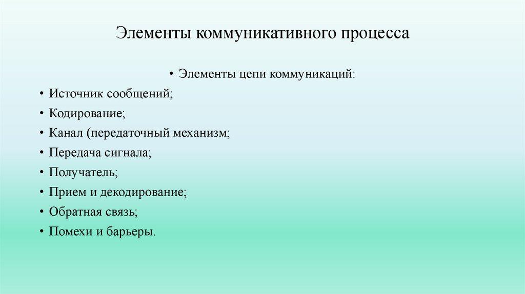 Элементы коммуникативного процесса• Элементы цепи коммуникаций: