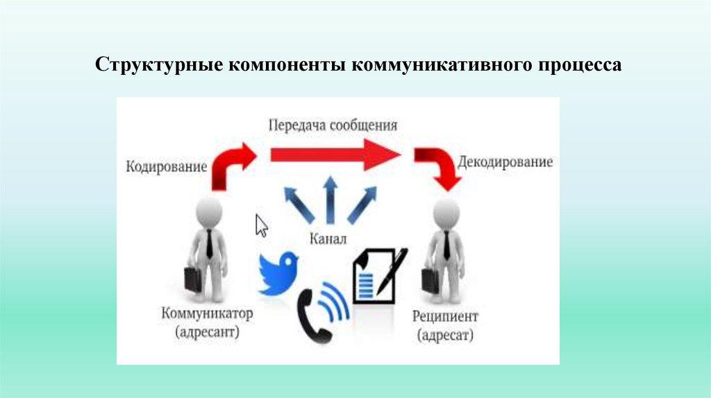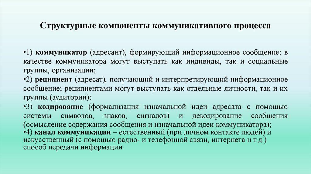 Структурные компоненты коммуникативного процесса•1) коммуникатор (адресант), формирующий информационное сообщение; в