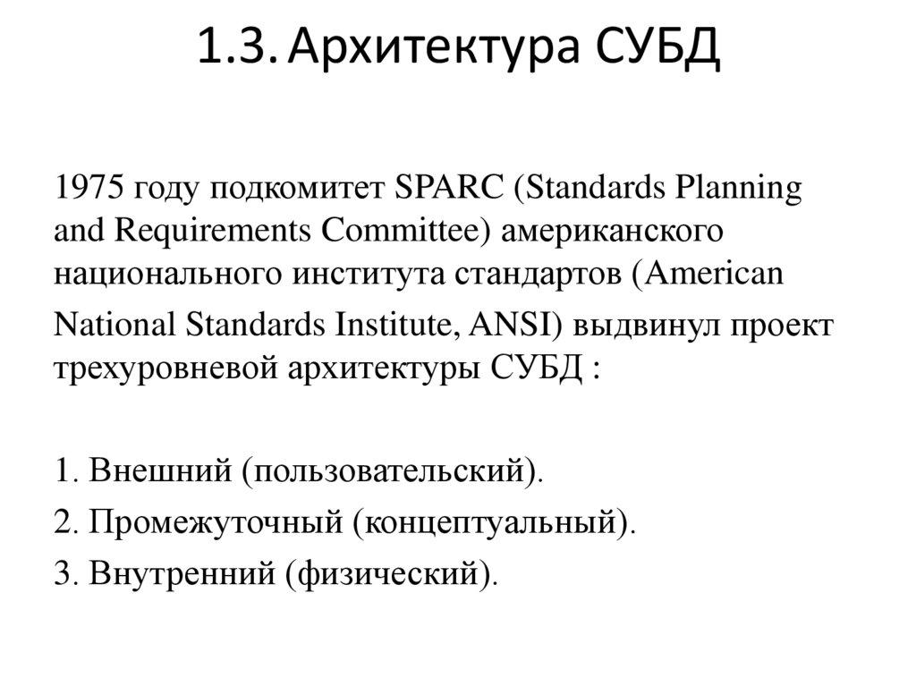 1.3. Архитектура СУБД1975 году подкомитет SPARC (Standards Planning