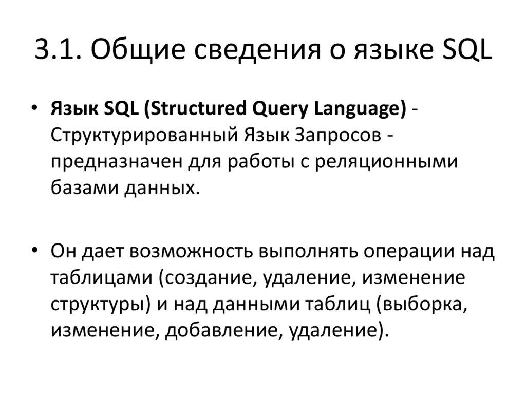 3.1. Общие сведения о языке SQL• Язык SQL (Structured Query Language) Структурированный Язык Запросов предназначен для работы с реляционными