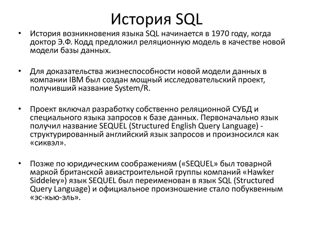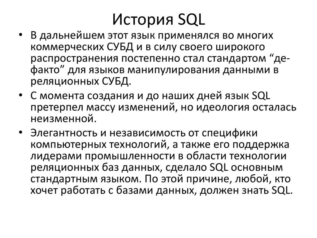• С момента создания и до наших дней язык SQL