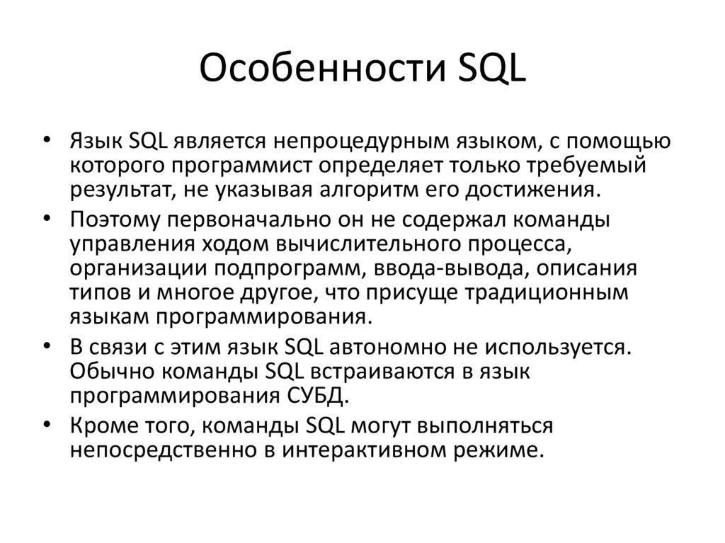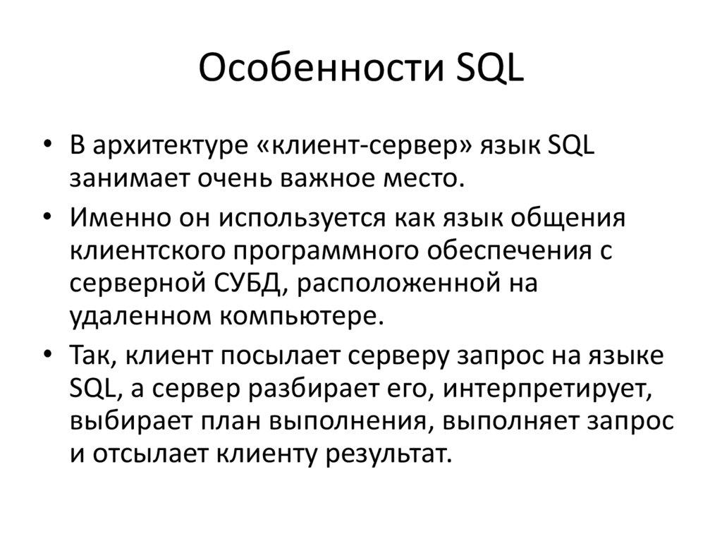 Особенности SQL• В архитектуре «клиент-сервер» язык SQL