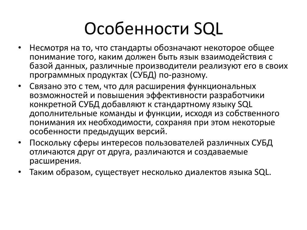 Особенности SQL• Несмотря на то, что стандарты обозначают некоторое общее