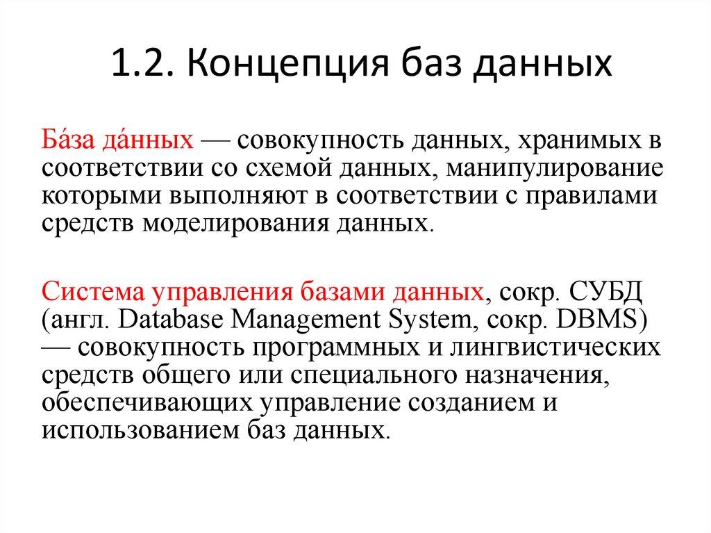 1.2. Концепция баз данныхБа́за да́нных — совокупность данных, хранимых в