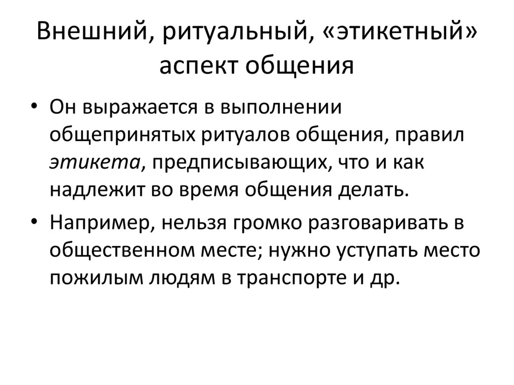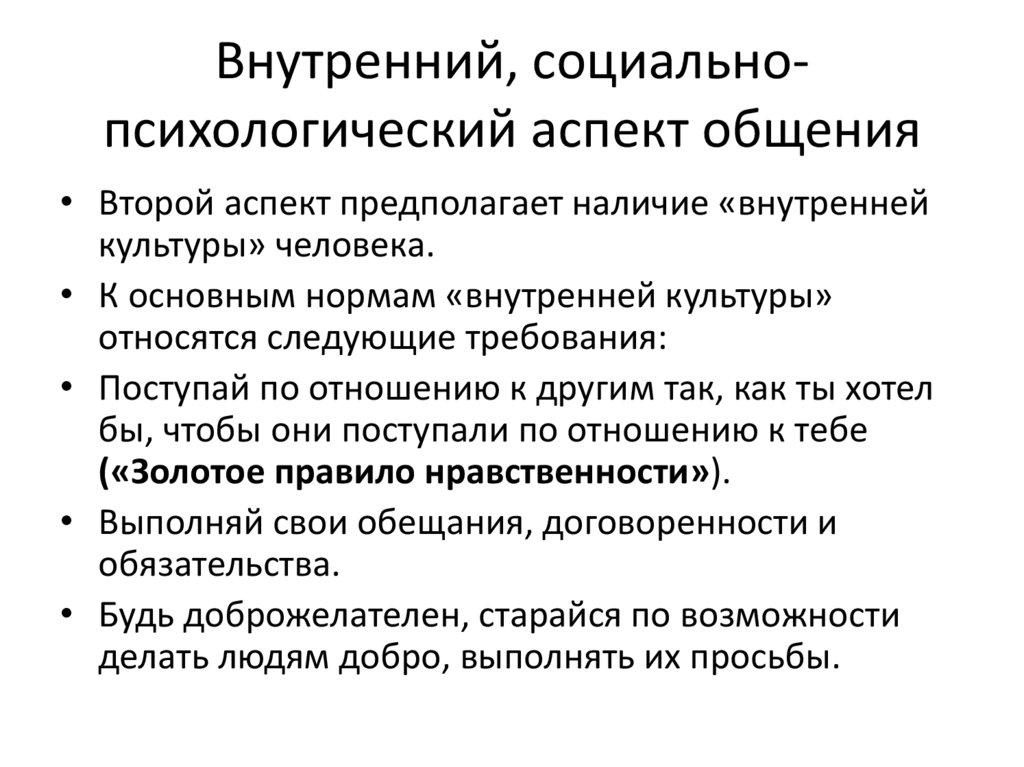 Внутренний, социальнопсихологический аспект общения• Второй аспект предполагает наличие «внутренней