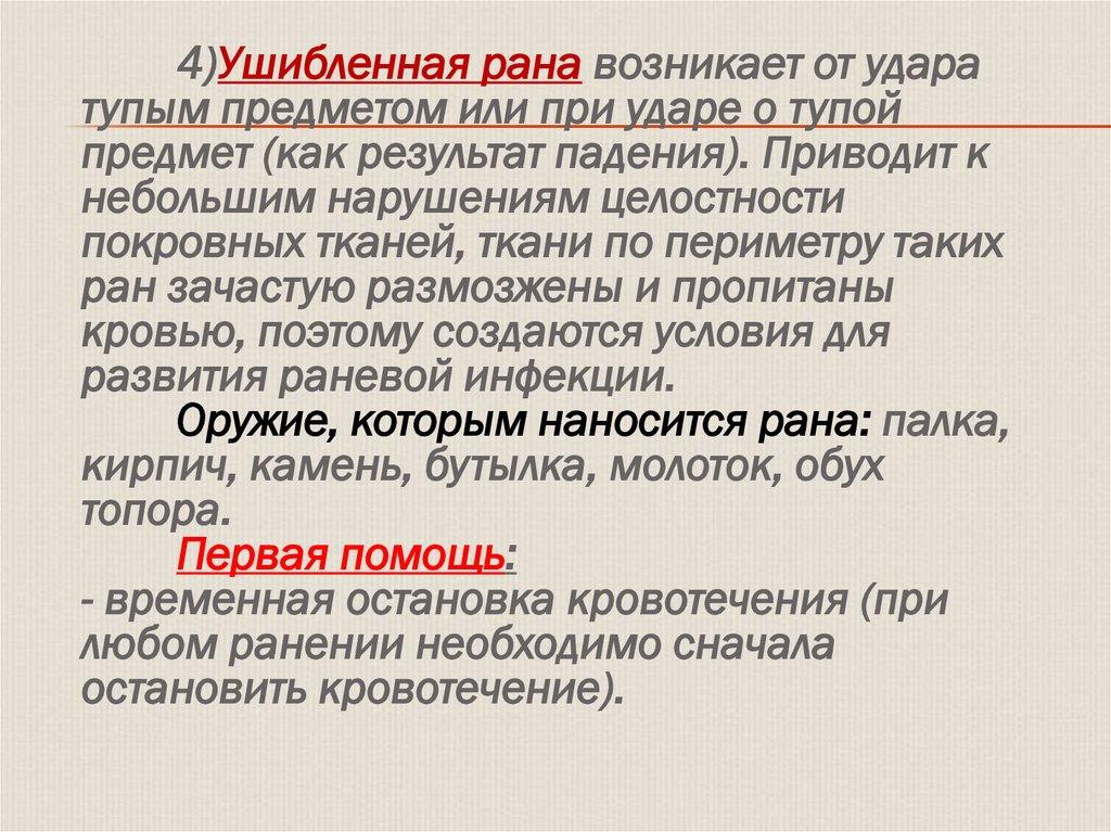 4)Ушибленная рана возникает от ударатупым предметом или при ударе о тупой