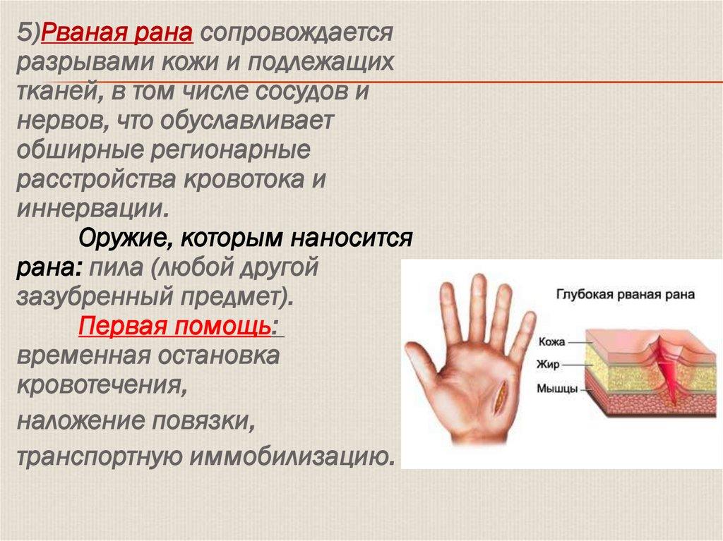 5)Рваная рана сопровождаетсяразрывами кожи и подлежащих
