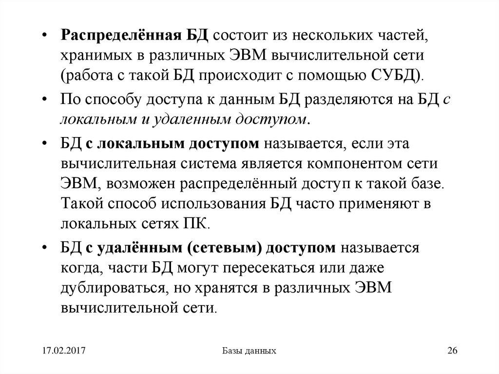 • БД с локальным доступом• БД с удаленным (сетевым) доступом: