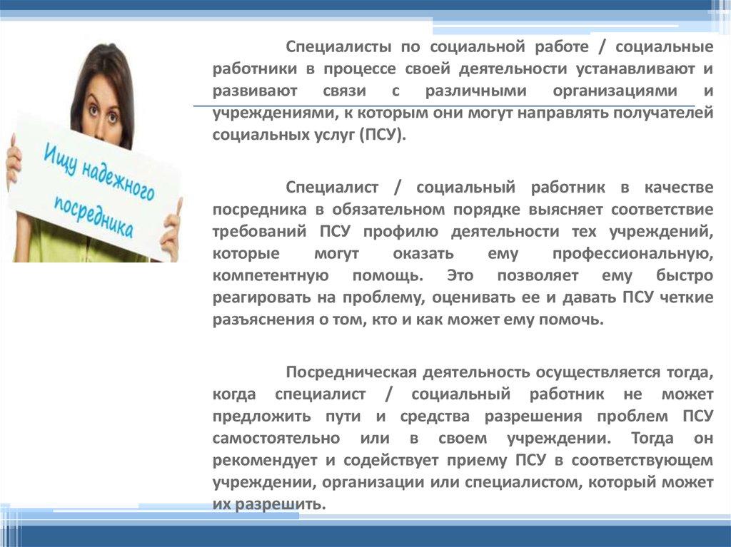 Технологии посреднической деятельности широко применяютсяв практике социальной работы. Специалист не всегда может в полном