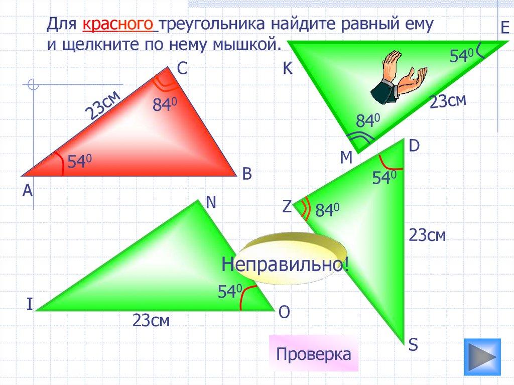 Для красного треугольника найдите равный емуи щелкните по нему мышкой.
