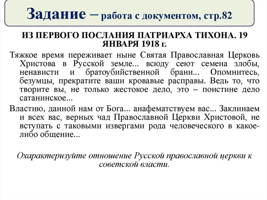Задание – работа с документом, стр.82ИЗ ПЕРВОГО ПОСЛАНИЯ ПАТРИАРХА ТИХОНА. 19