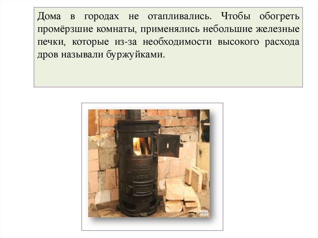 Дома в городах не отапливались. Чтобы обогретьпромёрзшие комнаты, применялись небольшие железные