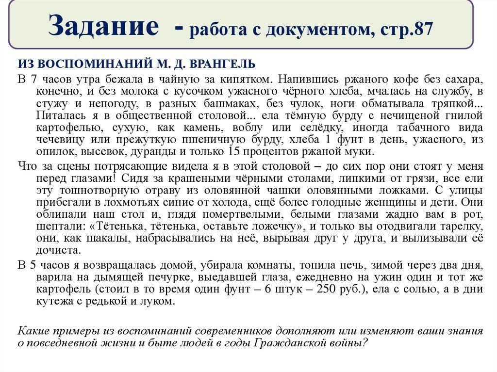 Задание - работа с документом, стр.87ИЗ ВОСПОМИНАНИЙ М. Д. ВРАНГЕЛЬ