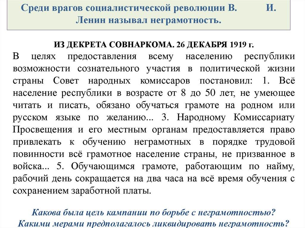 Среди врагов социалистической революции В.Ленин называл неграмотность.