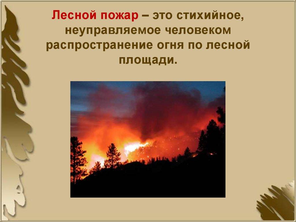 Лесной пожар – это стихийное,неуправляемое человеком
