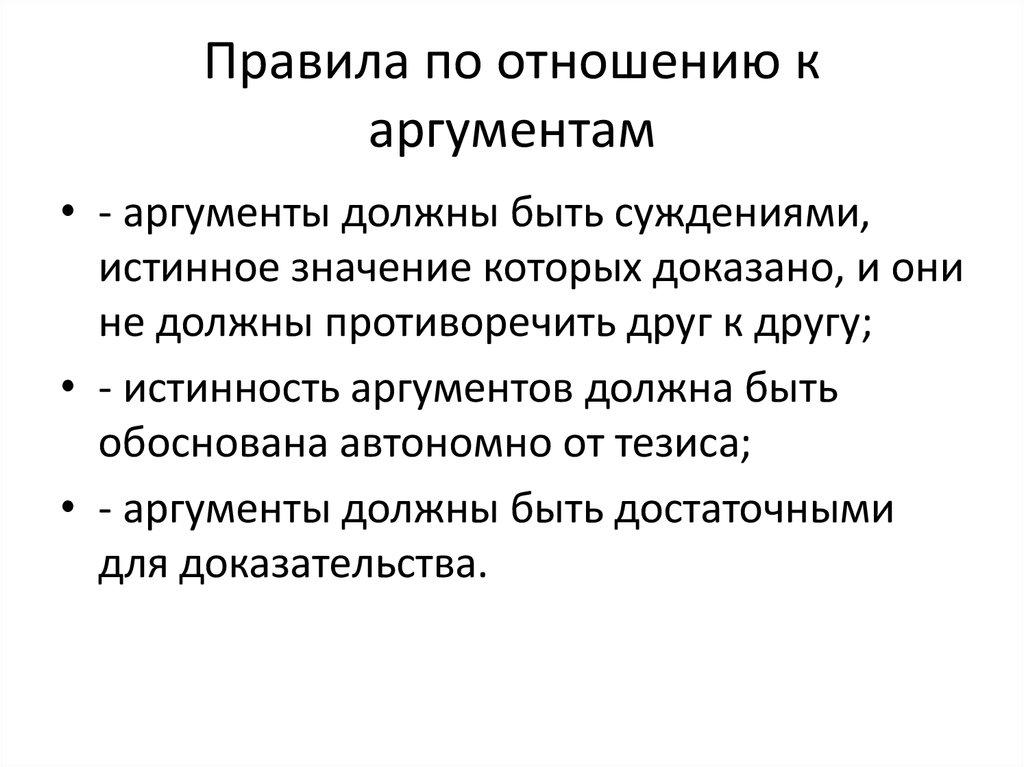 • - аргументы должны быть суждениями,истинное значение которых доказано, и они