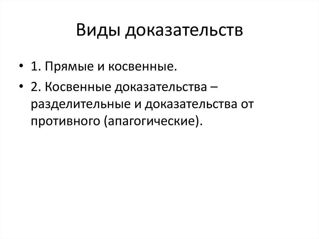 • 1. Прямые и косвенные.• 2. Косвенные доказательства –