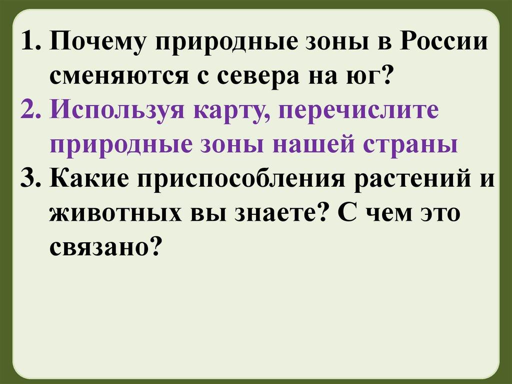 1. Почему природные зоны в Россиисменяются с севера на юг?