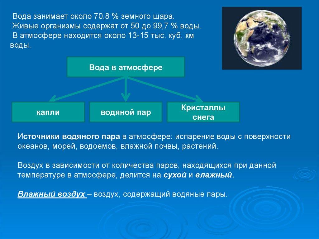 Вода занимает около 70,8 % земного шара.Живые организмы содержат от 50 до 99,7 % воды.