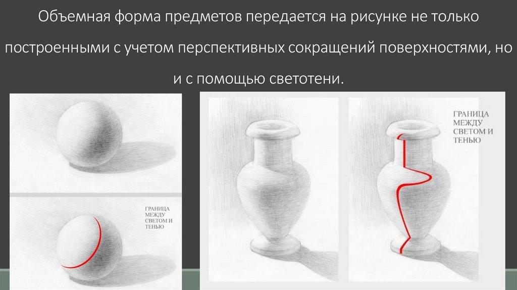 Объемная форма предметов передается на рисунке не толькопостроенными с учетом перспективных сокращений поверхностями, но