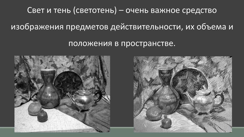 Свет и тень (светотень) – очень важное средствоизображения предметов действительности, их объема и