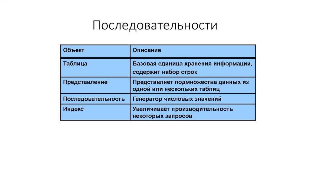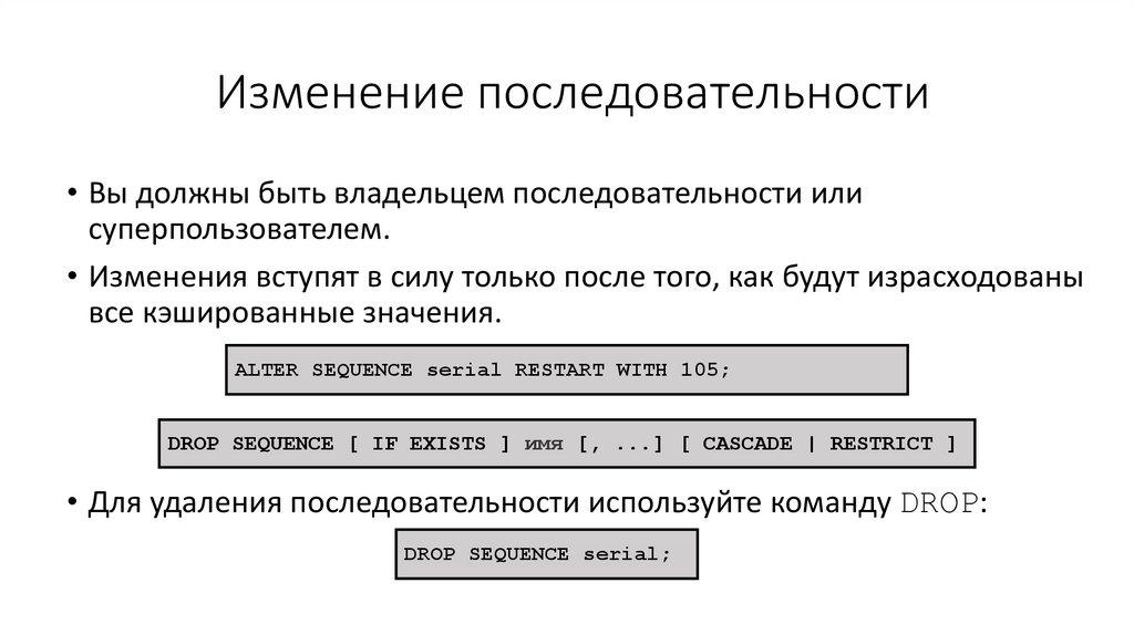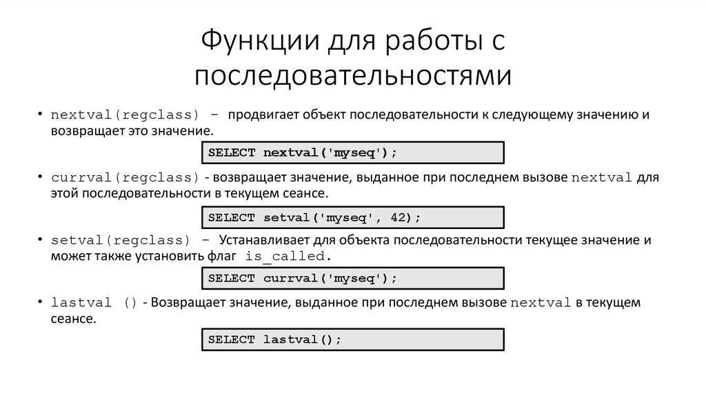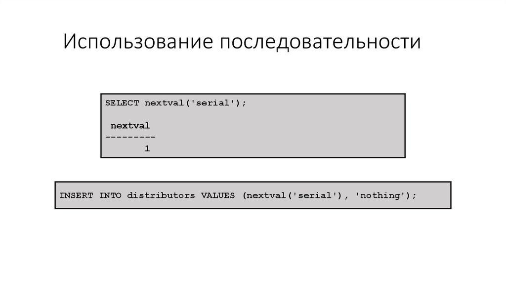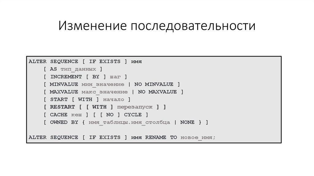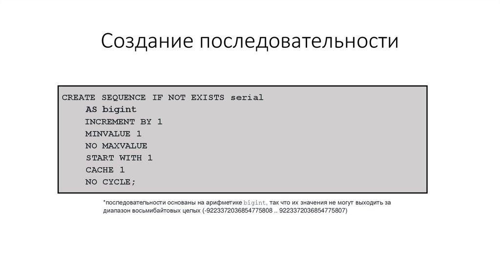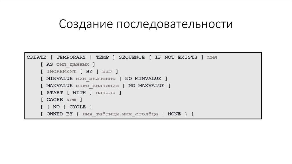 Создание последовательностиCREATE [ TEMPORARY | TEMP ] SEQUENCE [ IF NOT EXISTS ] имя