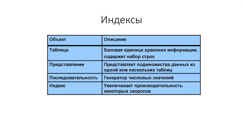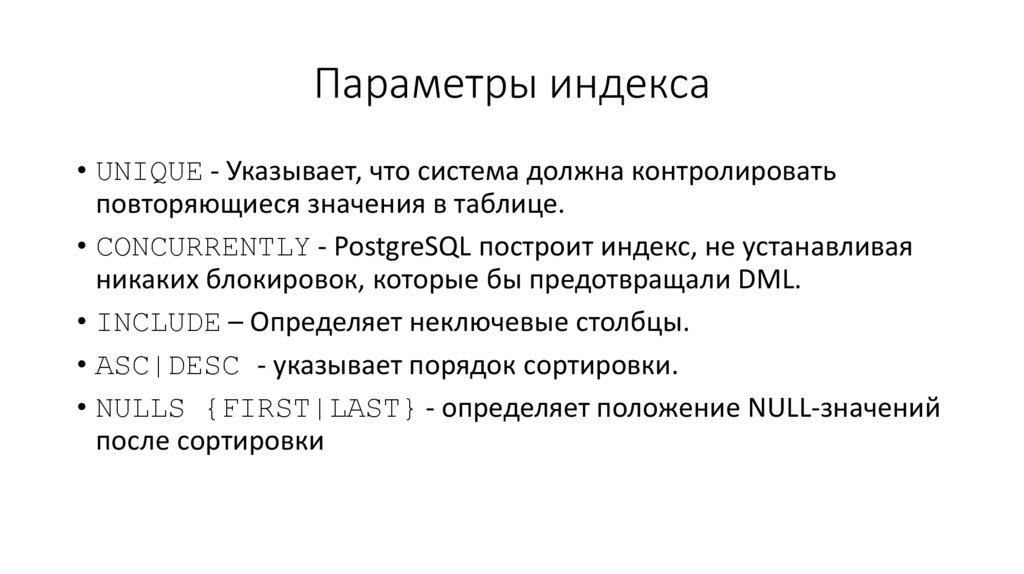 Параметры индекса• UNIQUE - Указывает, что система должна контролировать