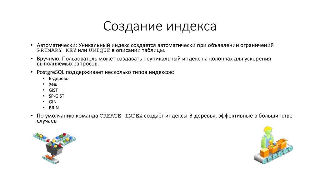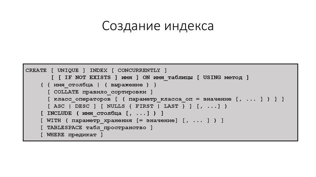 Создание индексаCREATE [ UNIQUE ] INDEX [ CONCURRENTLY ]